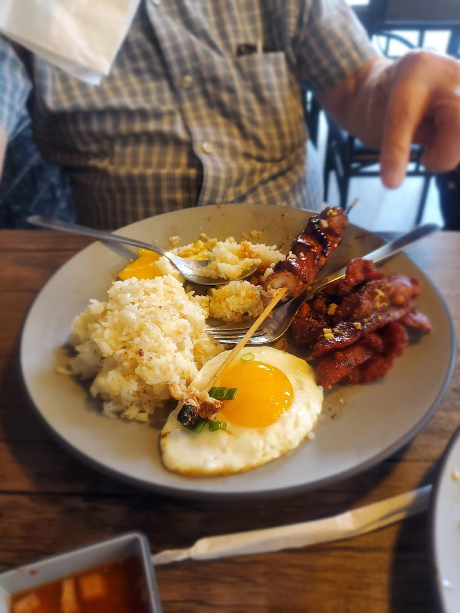 What an amazing Filipino restaurant. Very nice interior with a small market selling items that would either be hard or not sold in local markets. They sold a traditional sauce called Bagoong with Bagnet and I had to purchase it to try making some of their dishes after eating here. We started off with a type of lechon appetizer with fried tofu. The sauce was well balanced with sweet, spicy, and tangy. The second dish was the Tapsilog. It was served with a pickled papaya that I needed to have in every bite of whatever dish we ordered. I definitely would have purchased a jar of that. The last was the finale, the pork BBQ skewer. Loved the charred, tender, and juicy pork. My fiance loved this location and would definitely come back in the future. The service here was also uniquely amazing. We felt like we were visiting our friend and their parents were taking care of us. Next thing you know, you'll be chatting with the owner or the workers there and getting to know them. What a lovely spot, definitely visit if you're in the area or craving amazing Filipino food!